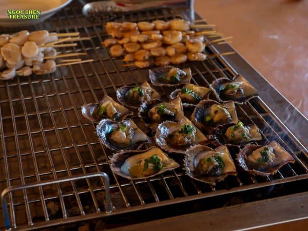 Sau những giờ vui chơi, gia đình sẽ cùng nhau thưởng thức các món ngon từ cồi trai như cháo nóng hổi, cồi trai nướng mỡ hành hay sashimi trai tươi ngon. Đây là khoảnh khắc gắn kết tuyệt vời, vừa ăn uống vừa ngắm biển chiều lộng gió.